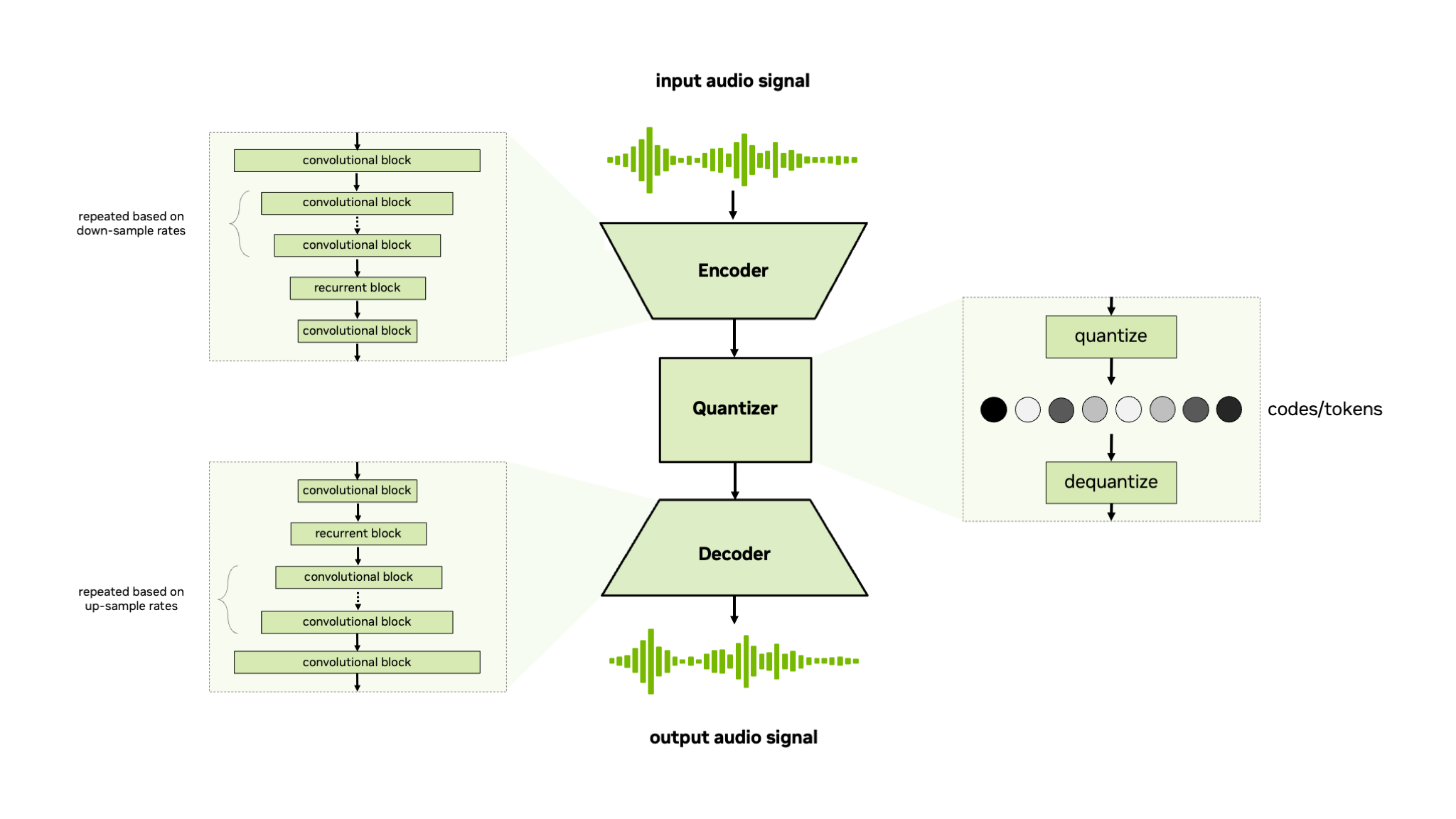 The NeMo Audio Codec model is a non-autoregressive convolutional encoder-quantizer-decoder model for coding or tokenization of raw audio signals or mel-spectrogram features.