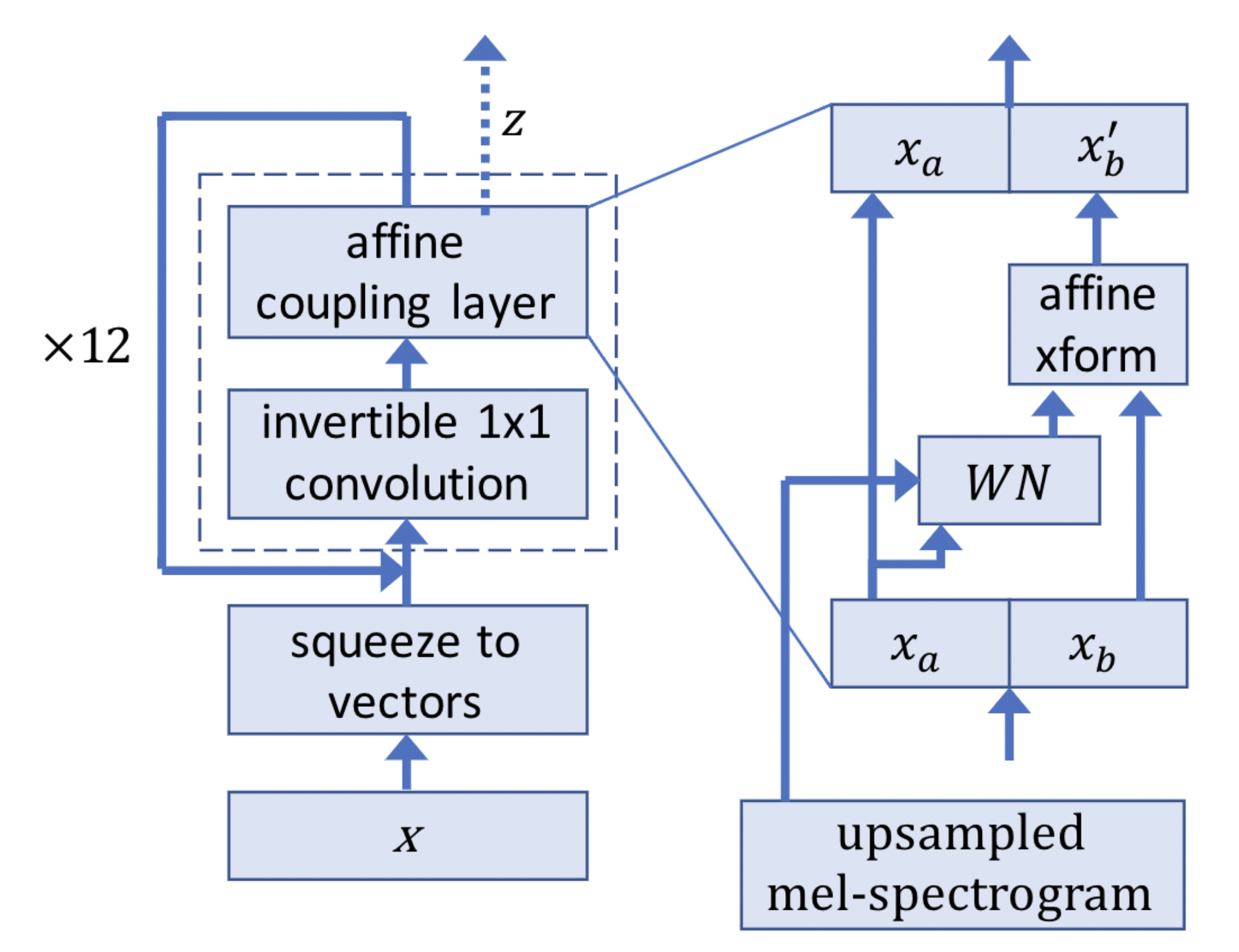 WaveGlow combines insights from Glow and WaveNet to provide fast, efficient and high quality audio synthesis without the need for auto-regression. WaveGlow is implemented using only a single network, trained using only a single cost function, i.e. maximizing the likelihood of the training data, which makes the training procedure simple and stable. Despite the simplicity of the model, our Pytorch implementation could synthesizes speech at more than 500kHz on an NVIDIA V100 GPU, and its audio quality is as good as the best publicly available WaveNet implementation trained on the same data. The model network is most similar to the recent Glow work as shown below. For the forward pass through the network, we take groups of 8 audio samples as vectors, which is called as “squeeze” operation. We then process these vectors through several “steps of flow”, each of which consists of an invertible 1x1 convolution followed by an affine coupling layer. Please refer to [TTS-MODELS7] for details.